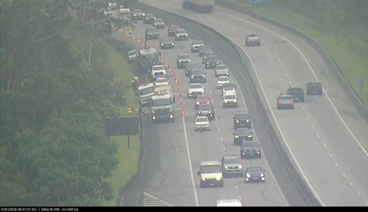Acidente grave interdita totalmente a rodovia SP-123 em Tremembé, com caminhão pegando fogo após colisão contra motocicleta. Autoridades avaliam tráfego congestionado e investigam causas da colisão na tarde de quinta-feira.