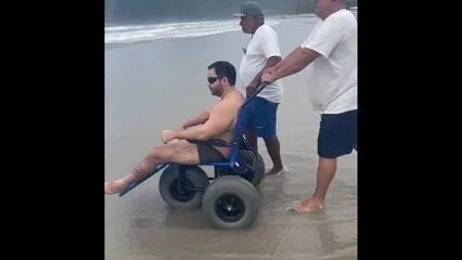 Recuperado de grave acidente, médico cego e amputado retorna ao mar na Praia da Baleia após anos de recuperação, graças ao projeto inclusivo para pessoas com deficiência.