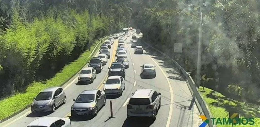 Turistas enfrentam longas filas e trânsito intenso rumo ao litoral paulista, afetando trechos da Dutra e Tamoios; motoristas devem planejar rota devido a acidente em Caçapava.