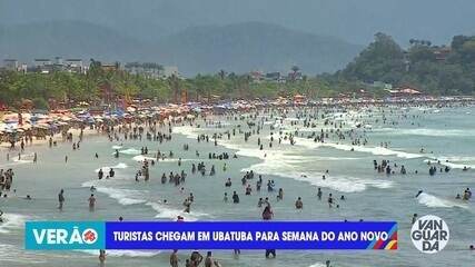Turistas tomam Praia Grande em Ubatuba, impulsionando o turismo no Litoral Norte de SP em um dia de intenso calor e tráfego nas principais rodovias.