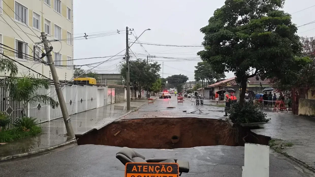 Cratera engole parte de rua em São José dos Campos, gerando interdições e evacuação em área afetada pela chuva.